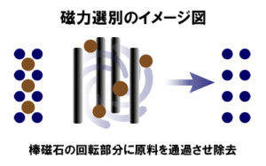磁選装置を使用することで原料中に混入している金属異物を取り除くことが可能です。